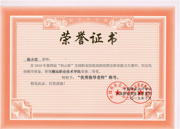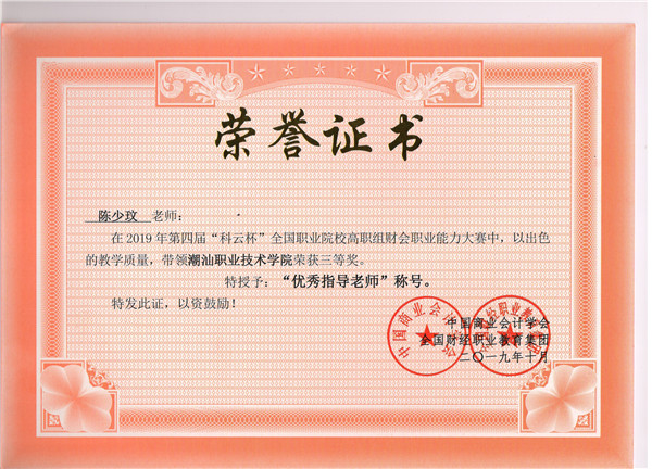 10月26日,通过校内选拔赛的两支队伍在B507参加2019年第四届“科云杯”全国职业院校高职组财会职业能力大赛网络赛。我院方秀玲、陈少玟老师以出色的教学质量,带领潮汕职业技术学院荣获二、三等奖,被授予“优秀指导老师”称号。