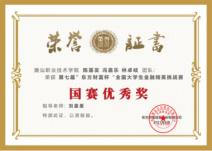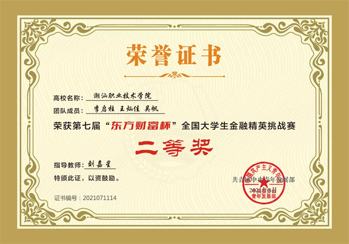 第七届“东方财富杯”全国大学生金融精英挑战赛是由共青团中央青年发展部主办的面向全国大学生群体打造的具有高知名度、高含金量及广泛社会影响力的金融创新实践大赛。本届大赛以“燃财富梦想,登人生巅峰”为主题,旨在帮助大学生掌握金融基础知识,增强金融安全意识,提高金融实践能力,完善就业创业素质。“东方财富杯”全国大学生金融精英挑战赛是享誉全国高校的金融行业顶级品牌赛事,被国内多所高校认定为国家级A类竞赛,全国累计共有超百万学生参加历届赛事。 潮汕职业技术学院参赛师生在国赛中成功获得二等奖3项、三等奖1项,国赛优秀奖13项。 威赖学滨、江晓婷、王梓威团队荣获二等奖 本届大赛自启动报名以来,吸引了全国2376所高校共40万余名大学生参与其中,潮汕职业技术学院共520名同学报名参赛,经过校赛和省赛的选拔,最终有17支团队成功晋级国赛。 最后,祝贺各位获奖的同学!