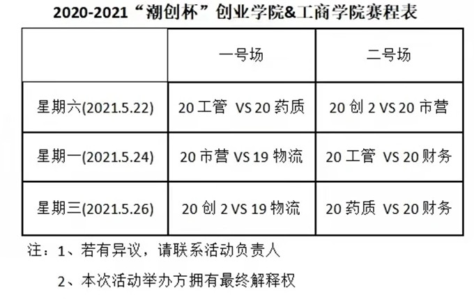 以下是小组赛的比赛情况: 5月11日 一号场 19创业2:20跨境 66:56 二号场 20创业:19药质 60:64 5月13日 一号场 20金融:20工管 47:70 二号场 20药质:19创业2 61:44 5月14日 一号场 20创业1:20财务 55:116 二号场 20药质:19物流 68:70 5月15日 一号场 20财务:19药质 90:62 二号场 20创业1:20创业2 49:79 5月16日 一号场 20药质:20跨境 76:58 二号场 20金融:20市营 57:91 5月17日 一号场 19创业2:19物流 52:54 二号场 20工管:20市营 82:107 5月18日 一号场 19物流:20跨境 54:58 二号场 20创业1:19药质 46:82 5月19日 一号场 20财务:20创业2 69:79 “外星人杯”的小组赛已结束,相信接下来的半决赛会更加精彩,期待进入半决赛的队伍更加精彩的表现。 “外星人杯”第一轮小组赛出线名单: A组:20药质、19物流 B组:20财务、20创业2 C组:20工管、20市营 注:若有异议,请联系活动负责人 朗义聪:18420011129 罗存杨:18520300490 李铱楠:13288076426 邓姗姗:17512022994