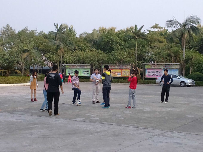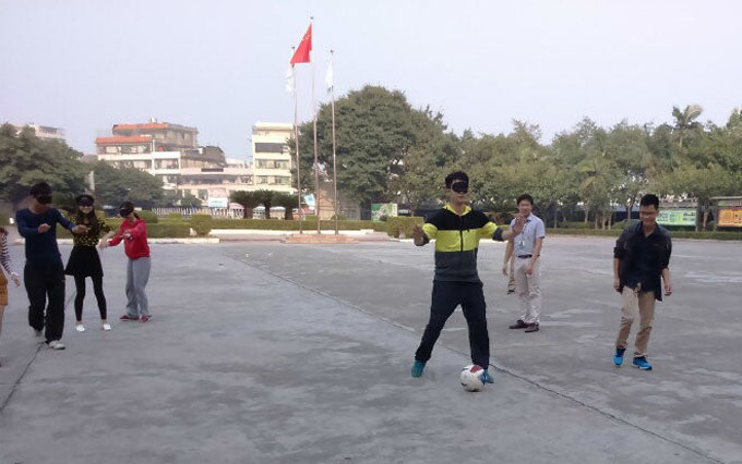林老师对拓展训练的目的、意义和规则进行了一番讲解,让学生明确目标和任务,了解游戏规则。随着一声哨响,人力班的一位女同学踢出了比赛第一球。游戏中,负责指挥的同学集中精力指引同伴前进,“盲人”运动员则一边听搭档解说,一边小心翼翼地带球向前;担任监护员兼边裁的同学尽忠职守,严格把守安全关口;各组队员的紧密合作,广场上不时传来进球的欢呼声……