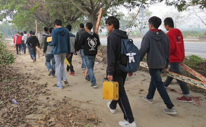 莲花山上,指导老师强调人身和设备安全,解说操作要领,同学们分好组,沿山路进行测量,凝神操作,交流讨论,力求得出更加精确的测量结果。