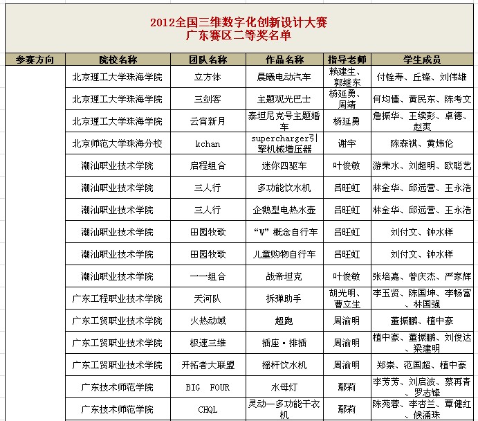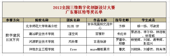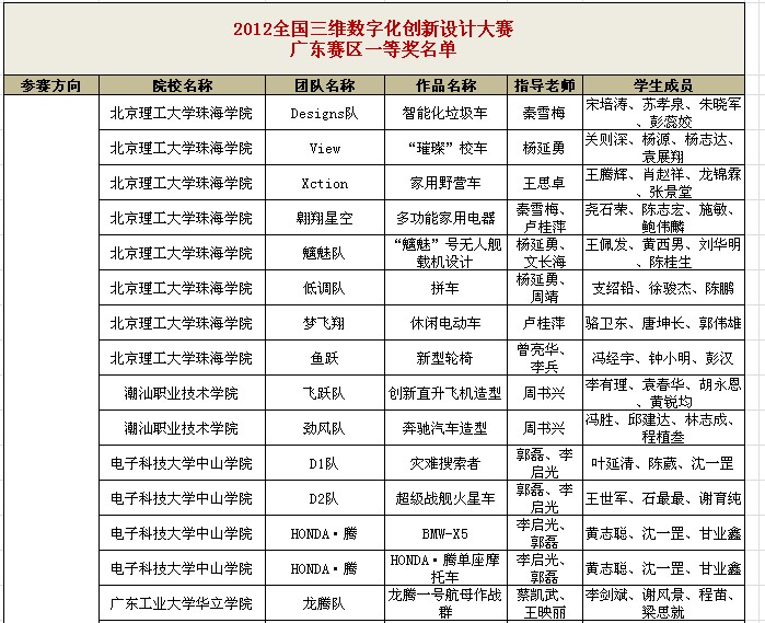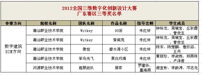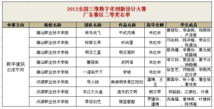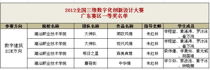 经过9个月的经过学校初赛、网络公示投票、作品资格审查、赛区复赛评审,由潮汕职业技术学院数字设计工程系朱红林老师、周书兴老师、吕旺虹老师、叶俊敏老师组队参加2012年第五届全国3D大赛赛区选拔(复赛)广东赛区获奖名单已经陆续揭晓。最终,我系选送的作品在整个广东赛区所有四百多个参赛作品中脱颖而出,我系分别参加工业与工程方向和数字建筑BIM方向共荣获2个特等奖、6个一等奖、11个二等奖、4个三等奖。