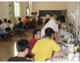 黄海宏主任视察实训室 电子老师指导学生实验 王阗老师查看学生实习手册 电路板调试 电工实训设备 黄主任、王阗老师查看电工测试设备...