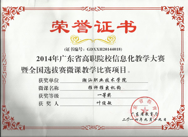 近日,广东省第二届全国高校微课教学比赛结果揭晓,在 “广东省第二届高校微课教学比赛”中,我系叶俊敏老师的微课作品《推杆推出机构》获得一等奖。...