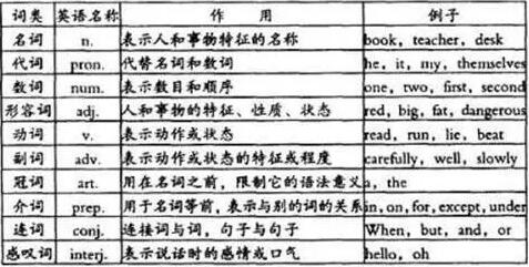 一、词类:英语词类分十种:名词、形容词、代词、数词、冠词、动词、副词、介词、连词、感叹词。![]() 1、名词(n.): 表示人、事物、地点或抽象概念的名称。如:boy, morning, bag, ball, class, orange。
