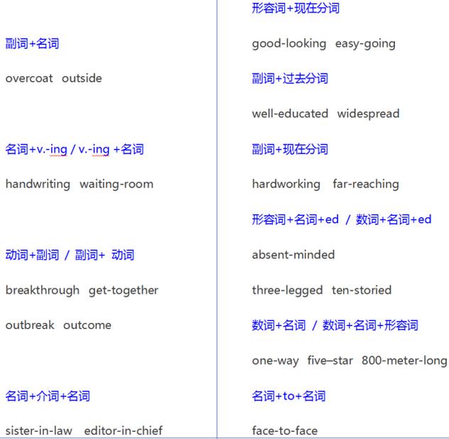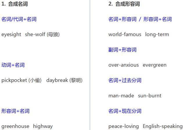 由两个或两个以上的单词连在一起合成一个新词,这种构词法叫做合成法,合成的词叫做合成词(compounds)。合成词的写法由习惯决定,可以写在一起,也可以用连字符号连接。