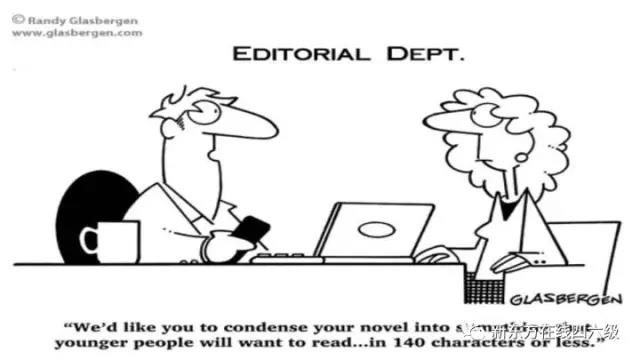 上图中有一位编辑正在和一位作者在编辑部谈话。这位编辑舒适地坐在沙发里,手里拿着手机,要求作者把她的小说浓缩到140词以吸引年轻人。