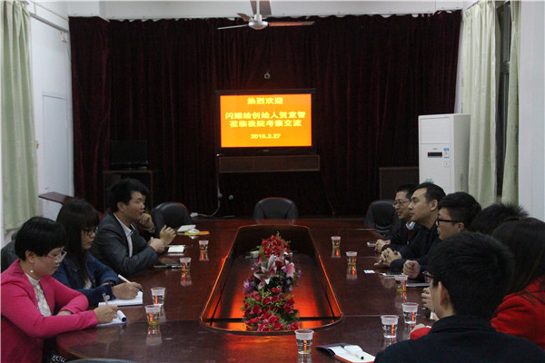 2016年2月27日,闪耀绘创始人贺宣智一行来我院考察交流,我院院长助理兼党政办主任李育华、跨境电商实战学院院长陈江生、跨境电商实战学院院长助理叶炳森等领导亲临接待。