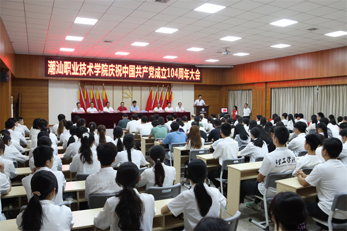 潮汕职业技术学院举行庆祝中国共产党成立104周年大会 6月30日下午,潮汕学院在第二报告厅隆重举行庆祝中国共产党成立104周年大会,学校全体师生党员参会。 大会现场 党委副书记王笃学同志主持大会 ☆ 全体起立 奏国歌 ☆ ☆ 新党员入党宣誓 老党员重温入党誓词 ☆ 党委委员...