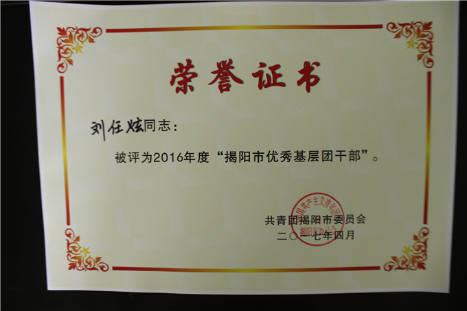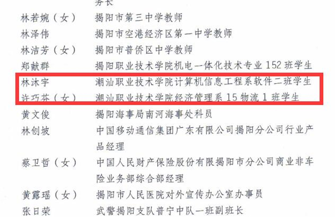获奖名单如下: (省级) 潮汕职业技术学院团委荣获“广东省五四红旗团委” 许巧芬同志荣获“广东省优秀共青团员”荣誉称号 林沐宇同志荣获“广东省优秀共青团员”荣誉称号 (市级) 陈振明同志荣获“揭阳市优秀基层团干部” 刘任炫同志荣获“揭阳市优秀基层团干部” 吴凯敏同志荣获“揭阳市优秀基层团干部” 黄 霞同志荣获“揭阳市优秀共青团员” 郑雪娜同志荣获“揭阳市优秀共青团员” 陈国中同志荣获“揭阳市优秀共青团员” 李 旋同志荣获“揭阳市优秀共青团员” 许佳楠同志荣获“揭阳市优秀共青团员”
