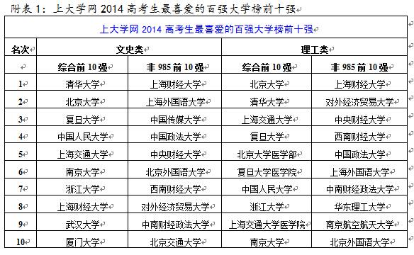 近日,以自主研发“中国虚假大学警示榜、中国大学最爱的本科专业排行榜”等大学和专业榜单闻名、高中生私人订制网站——上大学网,通过互联网原创首发《上大学网2014高考生最喜爱的百强大学榜》,其中,清华大学(微博)、北京大学、复旦大学、中国人民大学、上海交通大学(微博)、浙江大学、南京大学(招生办)等名校,都分别位列在全国10个高考大省、涵盖486万2014届文史类和理工类高考生最喜爱的百强大学榜的前十。 经对比发现,这是中国首份采用“高招大数据”统计制作而成的大学综合实力排名榜,是2014年全国一大半优秀高考生在填报志愿时,用自己的实际高考分一所一所“选择”出来的中国大学排名榜。 综合前10强:文科超级学霸更爱清华 根据《教育部(微博)通知进一步推进高校招生信息公开工作》(教学函[2013]9号)中的“高校分批次、分科类录取人数和录取最低分等”录取结果公开等“十公开”原则,以及《教育部办公厅关于做好2014年全国普通高校招生录取工作的通知》(教学厅[2014]2号)“加强信息公开”等相关要求,上大学网从广东、河南、山东、安徽、江苏、河北、湖北、湖南、陕西、江西等10个高考大省的省高招委(省级教育考试院)官方网站,采集到各省“2014年普通高校招生本科第一批次院校最低投档线”(文史类和理工类)等录取分数线数据,研发制作了《上大学网2014高考生最喜爱的百强大学榜》,分为文史类、理工类两个组合榜单。 《上大学网2014高考生最喜爱的百强大学榜(文史类)》显示,深受10个高考大省优秀文科生喜欢的前10强高校分别是:清华大学、北京大学、复旦大学、中国人民大学、上海交通大学、南京大学、浙江大学、上海财经大学、武汉大学(微博 招生办)、厦门大学。 从榜单数据可以看出,清华大学在其中9个省招录文科生的最低投档分,平均位次都是最高的,都是第1名。然而,素以“文科见长”的北京大学却只在安徽省招录文史类考生拿到了最低投档分平均位次第1名。 由此可以得出,全国大部分省份高考分数在金字塔尖上的文科生,绝大部分都会选择报考清华大学、北京大学、复旦大学和中国人民大学这四所高校。 同样的,《上大学网2014高考生最喜爱的百强大学榜(理工类)》显示,深受10个高考大省优秀理科生喜欢的前10强高校分别是:北京大学、清华大学、上海交通大学、复旦大学、北京大学医学部、复旦大学医学院、中国人民大学、浙江大学、上海交通大学医学院、南京大学。 由这份榜单数据可以得出,北京大学、清华大学、上海交通大学、复旦大学是全国大部分省份理科生“超级学霸”最向往的四所名校。同时,北京大学和清华大学在理科尖子生中的地位实力相当,其均值排名为1.5和1.6,相差较小。 ![]() 非985前10强:上财均第一,财经政法外语类大学成高考生首选 据上大学网对文史类、理工类两份百强大学榜统计分析到:目前全国共有39所“985工程大学”,其中36所进入文史类百强,37所进入理工类百强;全国116所(含4所一体两地办学)“211工程大学”,有82所进文史类百强,81所进理工类百强;64所教育部直属高校进入文史类百强,63所进理工类,都占到全国教育部直属高校77所的八成以上。 在两份百强榜中,拥有97年悠久历史、不是985工程的“上海财经大学”勇往直前,位列文史类第8名,理工类第12名,超过众多国内知名综合型高等学府,更在众多财经类高校中排位第一。 文史类非985前十强:上海财经大学、上海外国语大学、中国传媒大学(微博 招生办)、中国政法大学、中央财经大学(招生办)、北京外国语大学(招生办)、西南财经大学、对外经济贸易大学、中南财经政法大学(微博)、北京交通大学(微博)。 理工类非985前十强:上海财经大学、对外经济贸易大学、中央财经大学、西南财经大学、中国政法大学、上海外国语大学、中南财经政法大学、华东理工大学(微博)、南京航空航天大学、北京外国语大学。 从以上两份非985前十强名单可以看出,财经类、政法类、语言类等高校成为了优秀高考生的首选,无论文理科型,但这些高校都是教育部直属高校兼211工程大学。 17所医药类大学进理工类百强 值得一提的是,北京大学医学部、复旦大学医学院、上海交通大学医学院三所医药类高校,在理工类百强榜中,能够超过中国人民大学、浙江大学、南京大学、南开大学、武汉大学等老牌综合名校,挺进理工类前10强,说明这三所大学的医学教育在全国医药类高校中实力名列前茅,深受优秀理科高中生的向往。 同时,上大学网发现,在《上大学网2014高考生最喜爱的百强大学榜(理工类)》中,居然有多达17所医药医科型专门高校,远超过其他非综合型门类高校数量,说明我国现今志向于学医从事卫生医药事业的青少年大有人在。 ![]() 各地省属重点或省部共建高校多为行业高水平 此外,还各有20所、22所省属重点大学或省部共建高校进入到两份百强榜中,这些高校既不是985工程大学,也不是211工程大学,更不是教育部直属或中央部委直属的大学,但其中一部分有中央部委直属的背景经历。 例如,文史类百强榜中的华东政法大学、东北财经大学(招生办)、首都经济贸易大学(招生办)、北京第二外国语学院(招生办)、上海对外经贸大学、广东外语外贸大学、江西财经大学、汕头大学(招生办)、西安外国语大学等;理工类百强榜中的天津
