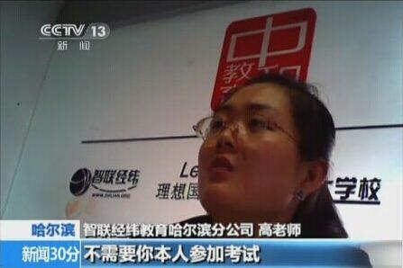 ![]() 智联经纬的高老师在接受采访的时候宣称“不需要你本人参加考试”。 黑龙江省一教育机构,承诺助考、保证通过自学考试,经央视曝光后,已经引发当地教育部门和国家教育部(微博)的关注。在此次发布会上,发言人没有回答涉案人数、金额以及智联经纬如何被定性为非法机构等关键问题。 当天晚间,教育部官方微博“微言教育”回应称,已责成相关省份的教育行政部门全面调查报道中反映的问题和线索,依法依规予以惩处。教育部相关负责人表示,一经查实,不管涉及什么组织、什么人,都将依法依规惩处,决不姑息。 助考机构宣称保证通过 “高等教育自学考试”简称自考,创立于1981年,三十多年来,全国参加考试人数上亿人,每年达数百万人。 “哪怕你是小学毕业,短时间内也可以获得本科证书;哪怕你是零基础,一年就能取得名校本科学历。”三名央视记者历时数月,以考生身份花费数万元体验了北京智联经纬教育咨询中心哈尔滨分公司的上述 “自考神话”,而且确如宣传的那样,零基础的3名记者全部通过。 今年5月9日,央视记者以咨询的名义,到位于哈尔滨市南岗区和兴商厦A座2001室的北京智联经纬教育咨询中心哈尔滨分公司。负责接待的高姓老师说:“不需要上学,就需要参加考试就行。你自己在外边报是挺难的,你要报我们学校就非常简单了。” 智联经纬网站宣称,零基础签约,一年取得名校专本科学历, 2013届考生通过率高达99.7%,高中毕业,初中毕业,哪怕是小学毕业,“只要您还想取得本科证书,选择智联经纬”。 智联经纬网页显示,哈尔滨师范大学、东北农业大学、黑龙江中医药大学、哈尔滨理工大学、黑龙江大学等黑龙江名校悉数在内,涵盖96个专业。智联经纬提供的招生简章上,还包括华中师范大学(招生办)、中国地质大学(招生办)、武汉理工大学(微博 招生办)、南昌大学(微博 招生办)、江西科技学院等院校。 工作人员承认操作都可以通过 在智联经纬报名参考需要多长时间全部通过并拿到学历? 上述高姓老师的答复是:考三次,一年考两次,一年半就能拿证。 如此短的时间,智联经纬如何做得到? 据高姓老师介绍,智联经纬有判卷老师,保证请黑龙江高校老师。“刚考完这一批全都过去了,考的时候只要告诉我们考的不好,我们都给操作过去了。” 操作是怎么回事?国家统一命题,统一考试,怎么操作? 工作人员回答说,要想在最短的时间内通过全部科目考试取得学历,考前、考后都需要操作。 按照智联经纬的说法,考前押题,“历年命题专家亲自出题预测”。除了押题外,考务大会上还有更为重要的培训。“培训告诉你在试卷上怎么做标记,咱们会告诉你咋答,在试卷上哪做标记。” 做标记的目的是让老师判卷时能够认出是智联经纬的考生。工作人员说,智联经纬的考务大会是由主考学校老师为学员统一讲解,怎么答题,如何在试卷上做标记。 该分公司许姓老师直言:“考前给你两套卷子,你答满背就行,通过率非常高,但是你必须按照我们要求答,内容对不对都无所谓。”前述高姓老师还说:“你要是答的不好,得给我们打电话,我们保证把分给你提上去,特殊照顾你。” 费用高昂只因助考有妙招 智联经纬教育招生简章显示,报考黑龙江大学、哈尔滨师范大学、哈尔滨理工大学等高校,专升本费用在9800元到11800元;报考湖北某高校,高中毕业取得专科学历,费用从9800元到19800元,取得学历的时间最长一年半,最短甚至半年。 黑龙江大学自考办介绍,自学自考学生,只需报考费,一科45元。按正常自考方式,全部报考费不超1000元。而经智联经纬报考费用从9800元到19800元,费用翻了10倍甚至20倍。 智联经纬2014年的招生简章中,还有几所大学标注为“协助考试”,华中师范大学、中国地质大学、武汉理工大学、南昌大学、江西科技学院等高校在列,学费从18000元到45000元不等,获得学历时间半年到一年半,获得学位证要另加8000元,“3万多,明年就下证。” 一名工作人员说。 “这个不需要你本人参加考试。”高姓老师明确告诉记者,“一次都不需要”,就是通过找人替考作弊。 通过智联经纬,无论自己考试还是替考,虽价格昂贵,但报名者不少。 高姓老师透露,她从今年5月1日开始,已经经办了40多万元学费,“我们总系统的得有好几百万了,六、七百万了”。 智联经纬官网显示,哈尔滨市智联经纬是中和基石国际教育科技(北京)有限公司下属的北京智联经纬教育咨询中心在哈分公司。分公司满墙挂着“高等教育自学考试优秀助考单位”等荣誉奖状。“我们全国连锁的,东北三省都有分校,全国30多家分校呢。”高老师说。 考前培训课十分神秘,老师提供题库 为了验证工作人员所说内容虚实,央视记者经过智联经纬报考2014年全国高等教育自学考试,体验智联经纬整个“助考”过程。3名记者分别报考了三所院校,一人报考费11800;一人报考费9800元;另外一人报考费18000元;三个记者均为跨专业、零基础。 按照规定,三名记者先交70%费用,剩余款项考试通过后补齐,智联经纬开出了保证通过协议,标明专业及通过时间。 在考试之前,记者参加了智联经纬的考务培训。培训进行得较为隐秘,工作人员等考生到齐后突然宣布更换教室。然后,所有学员进入另一个教室,智联经纬工作人员守在门口,陌生人不准入内。 然后,一位培训老师告诉考生:“大家只要把我和大家说的这几点。好好的