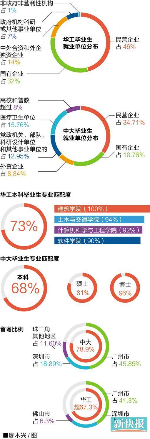 ![]() ■新快报记者 王娟 罗仕 通讯员 卢庆雷 2015年全国高校毕业生人数达到749万人的历史新高,那广东高校毕业生的就业率如何?近日,中山大学和华南理工大学相继发布《2015届毕业生就业质量年度报告》(下简称《报告》)。《报告》显示,中大与华工2015届毕业生的就业率分别为94.38%和99.34%。在毕业去向的选择上,两校的大多数毕业生就业均首选广东省。 中山大学、华南理工大学发布2015届毕业生就业质量报告 本科生爱进企业 据《报告》显示,从毕业生具体去向来看,华工“受雇全职工作”(62.9%)和“正在读研和留学”(28.8%)为主要的就业去向,两项指标在保持高位的同时质量得到不断提升。本科毕业生到500强企业就业的人数不断增长,2015年达到了30.43%;在就业人数减少的情况下,华工2015年海外深造人数比2014年增长了34.5%。 就华工毕业生的就业单位分布来看,民营企业占46%、国有企业占32%、中外合资和外企/独资企业占14%,政府机构科研或其他事业单位占7%,非政府非营利性机构占1%。这显示,企业仍然是本科生的主要去向,2015年共有92%的华工毕业生去了不同企业就职。 而中大进企业的学生也不少,其中,民营企业占34.71%、国有企业占18.76%、外资企业占8.84%,党政机关、部队、科研设计单位和其他事业单位的占12.95%,高于华工。此外,中大还统计了去医疗卫生单位的人数,占了15.76%,去高校和普教的人数也超过8%。 中大的本科生中,48.69%进民企,19.25%进国企,进外企的占12.75%,进企业的人数也超过了2015届本科毕业生总人数的八成。 专业匹配度较高 在专业相关度方面,华工73%的本科毕业生认为目前就业岗位与所学专业相关度处于一般及以上水平。其中,建筑学院(100%)、土木与交通学院(94%)、计算机科学与工程学院(92%)、软件学院(90%)毕业生工作与专业相关系数较高,均超过了90%。 据第三方调查显示,中大96%的博士毕业生和81%的硕士毕业生认为已落实的工作与专业相关,而本科毕业生的这一比例为68%。 留粤工作是首选 据《报告》显示,中大华工的毕业生,目前已落实工作地域主要集中在广东省。其中,中大毕业生在广东省就业的比例约为78.90%,其中,广州市占45.85%、深圳市占18.89%和珠三角其他地区占11.60%。而在所有的毕业生中,本科毕业生留在本地的超过81%;博士研究生去外省的比例相对较高,占31.83%,其中有9.46%的博士生去了西部地区。 而华工的毕业生城市流向统计显示,41.3%的在广州,19.7%在深圳,6.3%佛山。就工资收入来看,留在这三个城市的毕业生,转正后的收入分别为5911元,6558元和4853元,数深圳最高。 谋前程 ●哪些职业收入高? 据《报告》显示,中大2015年本科毕业生就业量最大的9大职业中,就业人数量排第五大的计算技术数据处理这一职业,转正后月收入最高,为7758元。而这一职业的研究生,在转正后收入达到9450元,高于其它就业量大的所有职业。 同样,在华工的统计中,本科生收入最高的职业也为计算机与数据处理,达到7123元。收入最高的专业是计算机软件专业,平均月薪达到7769元。 ●哪些职业最火红? 互联网开发和应用是华工2015年毕业生选择最多的职业,10.8%的华工毕业生选择了这个职业,该校从事该职业类毕业生3个月转正收入为6866元。 中大选择这个职业的学生,也占到了总毕业人数的10.2%,该职业成为中大毕业生选择第二多的职业。该校从事该职业类毕业生转正月收入为7608元。中大2015届毕业生选择最多的职业为财务/审计/税务/统计类,占该届毕业生人数总数的11.6%,该校从事该职业类毕业生转正月收入为6296元。 ●就业满意度 华工学生高出2014年全国平均数12个百分点 华工2015届毕业生的就业现状满意度为74%,高出2014届全国毕业生就业的就业满意度12个百分点,表明毕业生对就业岗位、发展前景认可度较高,比较符合自身的就业期望。 在毕业生对就业指导服务评价方面,麦可思调研结果显示:毕业生对学校就业指导服务整体上比较满意,认为发布招聘需求与薪资信息、辅导面试技巧、辅导简历写作、大学组织的招聘会有效的比例分别达到91%、87%、86%和82%。 该校相关负责人表示,据广州南方人才市场对毕业生综合素质、工作能力和就业服务的满意度调查结果显示:用人单位对华工毕业生的认可度超过95%,对就业服务的满意度超过93%。据悉,一部分已经毕业3年以上的往届毕业生逐渐成长为公司的业务和技术骨干人员。 读计算机的收入高 平均月薪破7500元 在薪酬水平方面,中大2015届本科毕业生的转正月收入为6147元,硕士生毕业后的平均月收入为6764元,博士生7729元。本科毕业生就业主要行业大类为:软件和信息技术服务业(12.02%)、互联网和相关服务(10.16%)。职业流向方面,较大的职业类为财务/税务/统计(11.6%)、互联网开发及应用(10.2%)、行政/后勤(9.9%),转正后的收入分别为6269元、7608元、5464元。转正后收入最高的职业类型是计算机与数据处理,达7758元。 华工本科毕业生三个月转正月收入达到5751元,其中超过6000元的占比达到31.5%,4001-5000之间的24.7%,5001-6000元的有18.7%。其中,转正收入在9000元以上的达到6.9%。其中,计算机科学与工程学院、软件学院的平均月薪均已突破7500元的大关。外资企业最高,达到6080元,民营企业其次,5860元。国企5546元,政府机构等5363元。