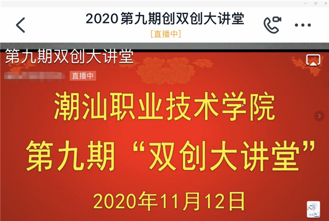 11月12日下午,潮汕职业技术学院2020第九期“双创大讲堂”暨1+X职业证书考试宣讲会在钉钉群直播。...