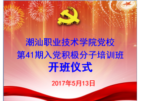 5月13日早上,潮汕学院第41期入党积极分子党校培训班开班仪式在综合楼第二学术报告厅举行。党委书记韩淑芳、院长助理李育华、团委书记王克明、团委副书记陈楠以及各二级学院团总支书记出席本次开班仪式。本次仪式由院长助理李育华主持。 开班仪式上,党委书记韩淑芳介绍...