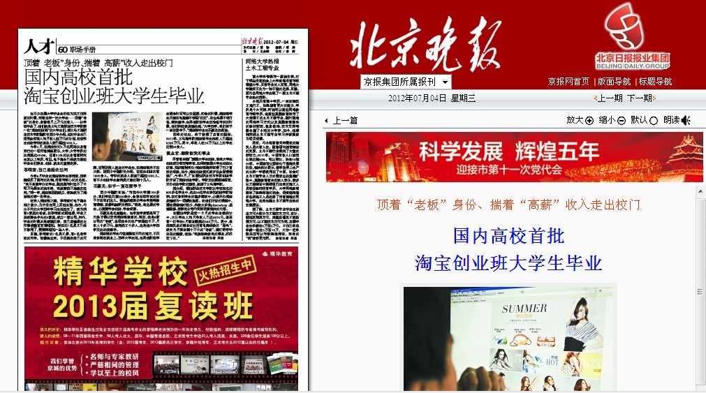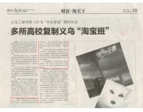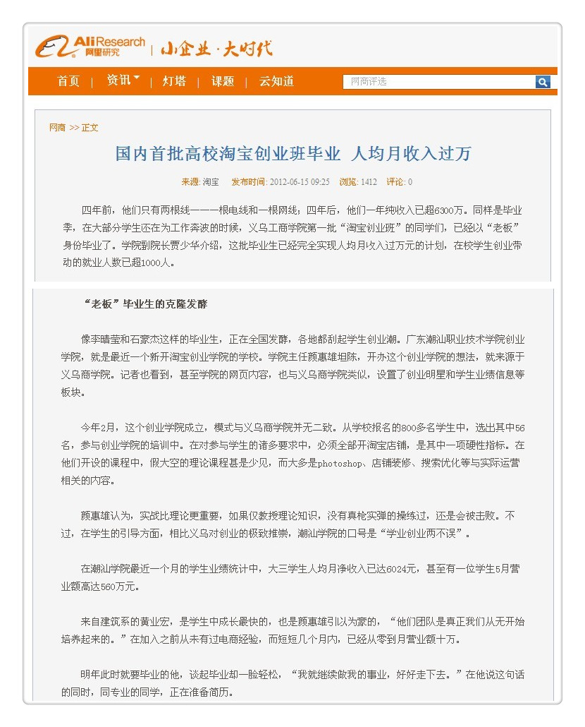 国内首批高校淘宝创业班毕业,人均月收入过万。淘宝网对义乌工商学院和潮汕职业技术学院的大学生淘宝创业情况进行报道。...