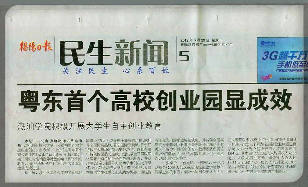 潮汕职业技术学院十分重视培养大学生自主创业,自今年2月份成立粤东首个高校创业园(创业学院)以来,积极组织学生开展以网络销售为特色的电子商务创业教育,目前已涌现出若干创业典型,创业园建设成效初显。...