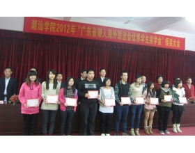 心生感恩,奉献社会 我院2012年广东省潮人海外联谊会奖学金颁奖大会 12 月7号,我院在科技楼开展了潮汕学院2012年广东省潮人海外联谊会优秀学生奖学金的颁奖大会。 出席此次颁奖大会的有:原广东省妇联主席、省人大秘书长,广东省潮人海外联谊会常务副会长兼秘书长林惠俗、...