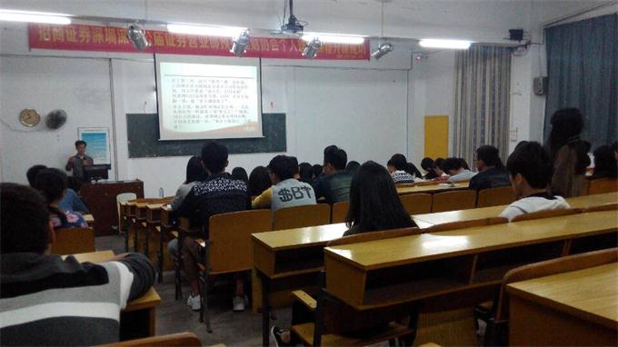 1129日晚,理财协会在科技楼105开理财讲座。此次理财讲座邀请了财金系主任张文洲老师担任主讲,张主任向同学们讲解了《如何理财之--思想篇》。张主任声情并茂的用各种理财致富的故事,阐述了你不理财,财不理你的真谛,向同学们详细的介绍了各种理财方式,并通过事例向同学们传授理财方法。让同学们清楚认识到理财在我们生活中的重要性。激起了同学们对理财强烈的求知欲。