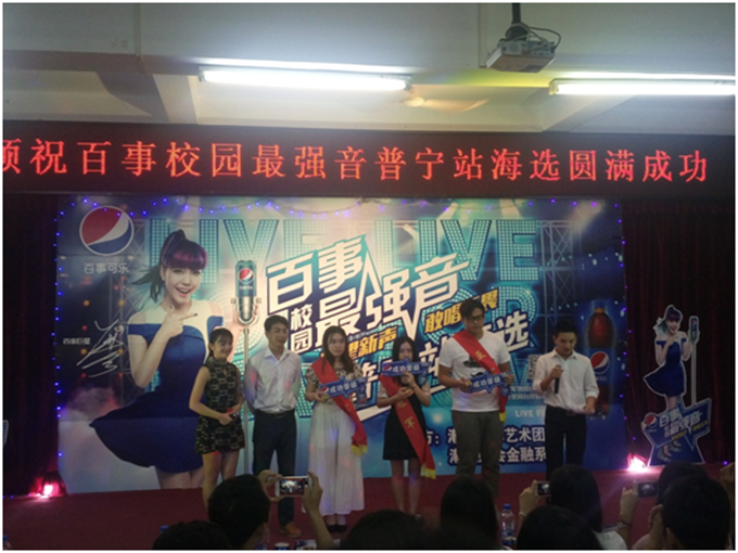 425日下午,财会金融系与星际艺术团携手百事可乐联合举办百事最强音普宁站海选。此次比赛以“张扬个性,打造音乐梦想”为主题,旨在带动校园文化的发展,培养学生艺术欣赏水平,展示艺术风采,提高艺术修养,丰富课余生活。