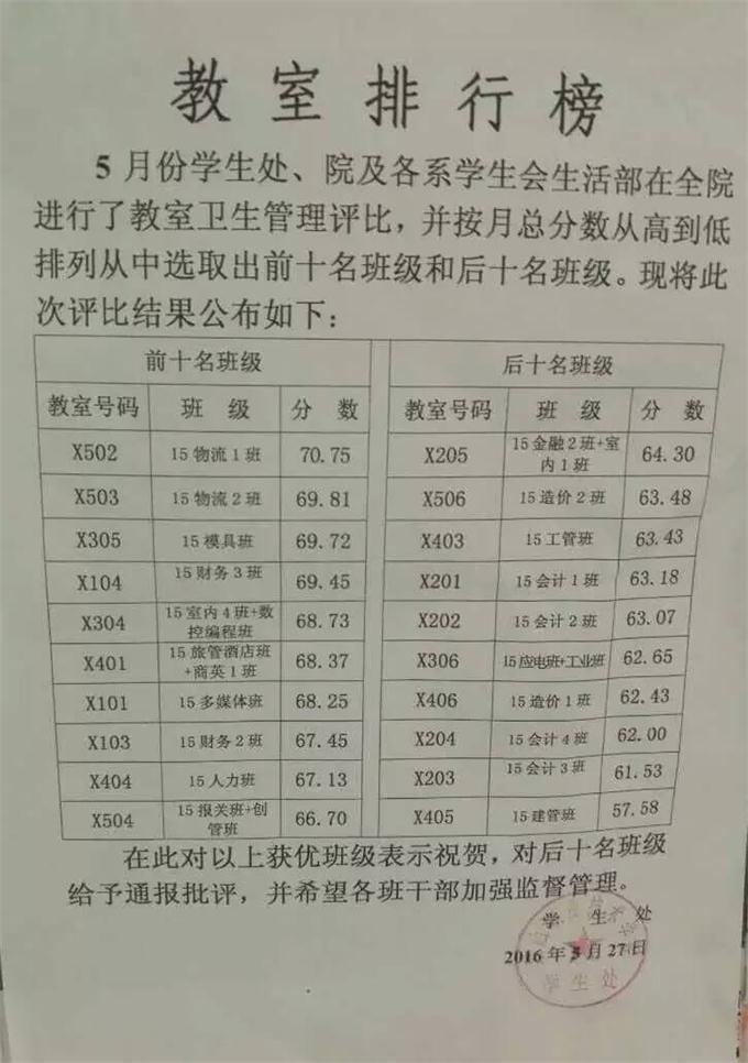 为进一步提高学生的生活质量,营造安全、整洁、文明的学习和生活环境,也为培养学生养成良好的卫生习惯。学生处、院及各系学生会生活部对全校教室进行了卫生大检查活动。 我系15级财务2班、3班荣获前十名班级。同学们纷纷表示,对教室卫生问题都非常重视。虽然牺牲了自己的时间,但没有任何抱怨,教室大多充满垃圾杂物以及灰尘,但没有人抱怨也没有人嫌弃,大家都在认真地尽自己所能的去打扫卫生,做自己能做的事情。为的就是为在教师上课的老师和同学们营造一个舒适的环境。大家一起在劳动中得到了快乐,也给别人提供了快乐方便。 此次卫生检查倡导同学们能够各尽其力,更加注意身边小事,保持教室的卫生,努力营造一个安全、健康、舒适的学习和生活环境,为共同创建安全和谐的美丽校园做贡献。 ![]() |