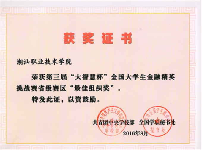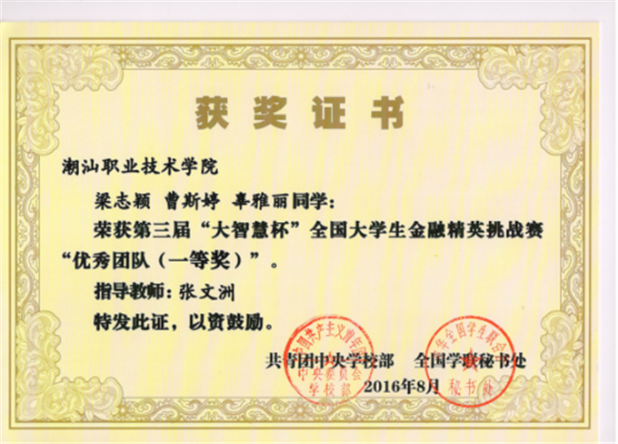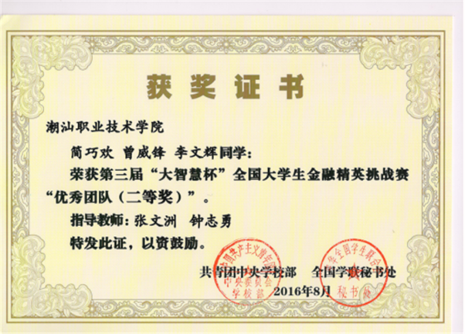 | 为响应党中央、国务院“大众创业,万众创新”的号召,推动青年学生“金融创业梦”计划,团中央学校部、全国学联秘书处自2014年起每年联合主办一场全国大学生“大智慧杯”金融挑战赛。2016年第三届“大智慧杯”全国大学生金融精英挑战赛于今年4月份开始,我院财会金融系接到通知后,迅速行动,精心组织,最终发动全院280多名同学参加本次比赛。 我院自2015年开始参加第二届全国大学生大智慧杯金融挑战赛。第二届大智慧杯全国大学生金融精英挑战赛,赛程分为预赛、复赛两个阶段。在2015年的比赛中我院有1人在复赛中获得全国金融操盘手一等奖,28人获得三等奖。 2016年第三届全国大学生大智慧杯金融挑战赛的赛程和赛事都采用了全新的方式,在赛程的分配上更加科学严谨,赛程分为校赛、省赛、国赛三个阶段,在校赛阶段学生以个人名义参与比赛,综合收益前30%的学生进入省赛,省赛以3人团队模式参与,综合收益前5%的团队进入国赛。在此次大赛中的国赛阶段,全国共有31个省、自治区、直辖市的6616个团队参与比赛,我院共有8个团队在国赛中斩获奖项:一等奖一个,二等奖一个,三等奖六个,此外,我院还是广东省三所获得大赛组委会评选为“最佳组织奖”的高校奖之一。 据悉,本届大赛共有来自清华大学、北京大学、厦门大学、上海财经大学、中山大学、华南理工大学等全国2000多所高校50多万名学生报名参赛。比赛分为校赛、省赛和国赛三个阶段,历时4个多月,参赛学生使用大赛专用平台,以A股、港股、股指期货三个投资品类进行投资策略比拼。 通过此次比赛,学生加深了对专业知识的理解与掌握,提升了学生的创新意识、市场意识和团队精神,有效地引导和开发了学生的创新思维,培养了学生的金融创新创业能力以及实践应用能力。 ![]() 优秀团队(一等奖)