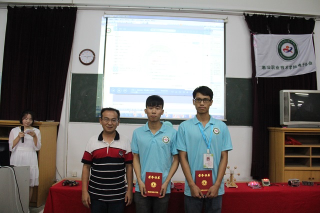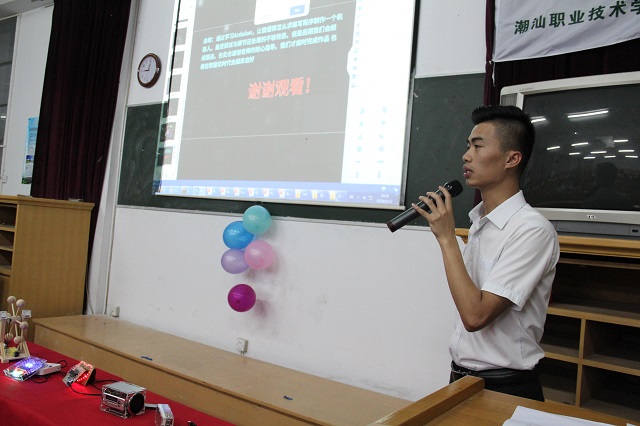 | 6月13日晚,潮汕学院第五届电子设计大赛在科技楼205举行,来自专业组的“车神F4”邓剑锋等同学以及来自非专业组的“Hello HiFi”陈定威等同学各获得大赛一等奖,信息工程学院副院长黄杰波出席并致辞,电子协会指导老师陈政光出席并对比赛做点评总结,设计工程学院谢怀林老师出席并为获奖项目颁奖。信息工程学院学生会主席团、社团联合会主席团、各协会会长等100多人参加。此次大赛由廖艳荧主持活动。 评委 黄杰波副院长向获奖团队表示祝贺,向所有参加大赛工作的工作人员表示亲切慰 问。协会指导老师陈政光在总结中勉励获奖团队戒骄戒躁、再接再厉,希望立足于技能培养,勤奋学习,苦练技能,以立志成才、服务社会为目标,不断提高自己的综合素质,增强自身的竞争能力,努力使自己成为符合时代要求的高素质人才。