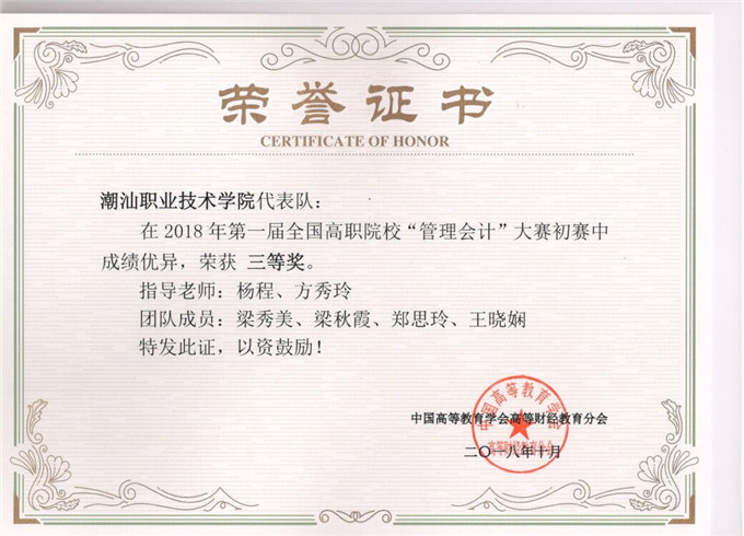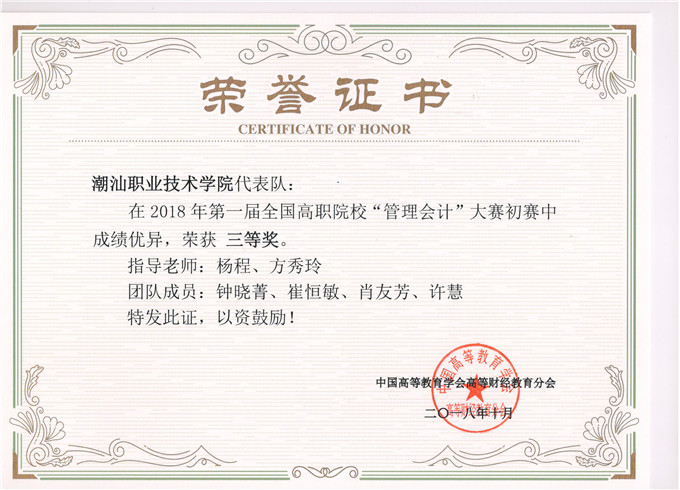 我院代表队荣获2018年第一届全国高职院校“管理会计”大赛初赛三等奖