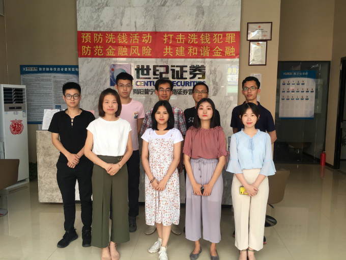 为了贯彻学院提出的深化校企合作、充分发挥校企双方的优势、共同培养与企业零对接的技能人才精神。我院本学期继续与校企合作企业——世纪证券普宁商品城营业部开展课程联合教学试点工作。本学期共选派5名17级金融专业同学到营业部进行相关课程实操跟岗实习。