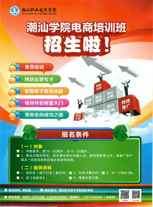 潮汕学院电商培训班招生 时间:2014-10-27 09:28 潮汕学院电商培训班招生 潮汕学院电子商务培训班开始招生,具体的内容请参考附件 潮汕学院电商培训招生简章1 潮汕学院电商培训招生简章2 (责任编辑:朱捍卫)