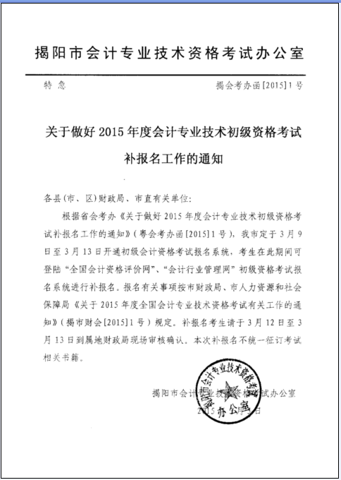 关于做好2015年度会计专业技术资格考试补报名工作通知