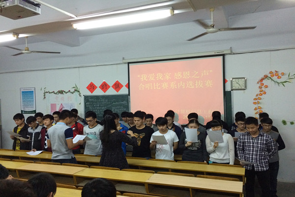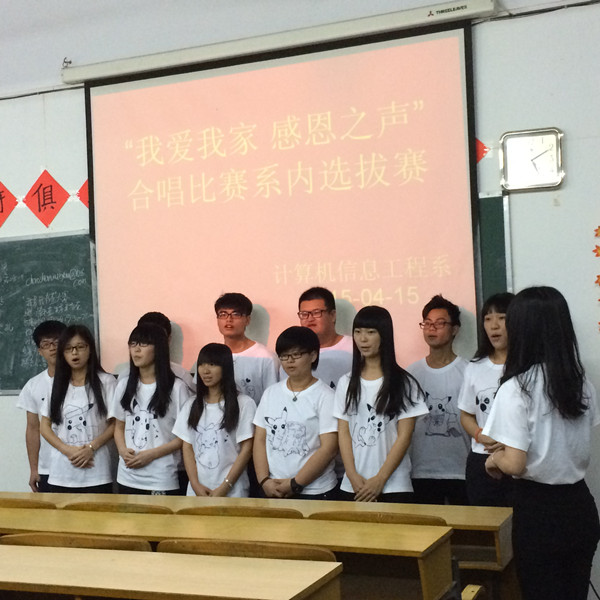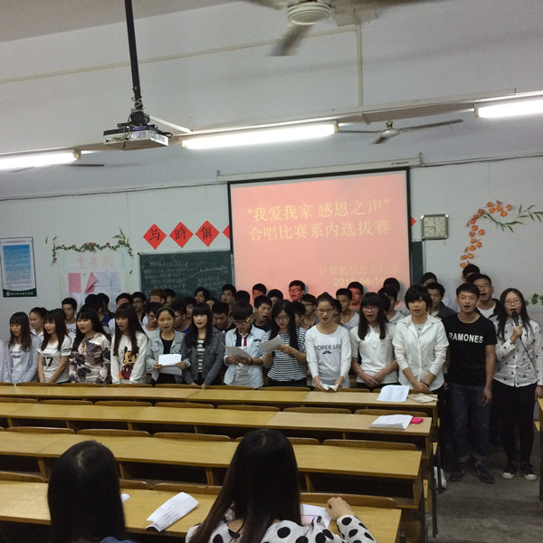 为响应院举办的首届“我爱我家,感恩之声”合唱比赛,我系于4月15日晚在科技楼201B举行了系内选拨,比赛由13,14级辅导员老师担任评委,比赛现场的秩序由计算机系学生会协助维持。 比赛一开始,13计网班为大家带来必唱歌曲《相亲相爱一家人》,紧接着带来自选歌曲《中国人》,气势磅礴,激情澎湃,为整个比赛开了一个好头。参赛的每一个队伍都精神饱满,充满激情,有一点点美中不足的是部分队伍演唱与伴奏配合不默契,感染力不强,但是总体表现均十分出色,称得上是一场听觉盛宴。 ![]() 第一个出场的13计网班 ![]() 服装统一的14美工班 ![]() 最为突出的14多媒体班 经过一轮角逐,评委们一致认为14多媒体,14美工,14计网,14软件这几个班表现最为突出,表示将从这几个班中选出两个队伍,代表我系参加院的决赛。希望到时有幸代表我系参赛的队伍好好努力,争取表现,为我系争取更多的荣誉。