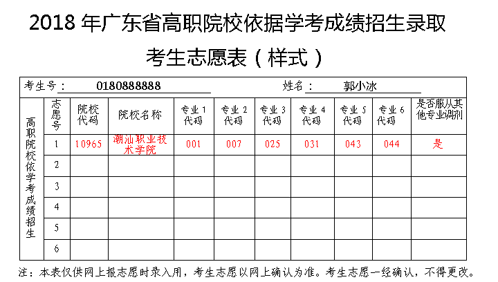 学院基本信息 2018年 学考招生安排 1、学考报名人数大幅度增加 据了解,2018年高职院校总招生计划93934名,考生报名人数23.2万人(文科170分以上为65252人,理科150分以上为61756人,合计127000人),2018年报考人数比2017年增加63000人,招生计划增加2万,总体来说,考生竞争更激烈。 2、志愿填报取消现场确认环节,直接网上确认 A、填报网址:http://www.ecogd.edu.cn/pgks/ B、填报志愿及确认时间:3月29日8:00--4月1日18:00 C、征集志愿填报时间:4月21日8:00--22日 16:00 D、考生可以填6个平行志愿学校,每个学校填报6个专业(把喜欢的学校和专业填在前面)。 3、录取分数线较2017年提高 第 一 次 录 取:文科170分,理科150分。 征集志愿补录:待定(根据以往会降分) 4、招录工作详细日程表 考生关注问题 1、怎样查询考生学考成绩及排位? 考生可在3月26日-4月1日期间,通过广东省教育考试院官微(gdsksy)小程序查询学考文科或理科总分排名。 2、平行志愿怎么填比较好? 不要求一定填满6个学校,每个学校填满6个专业。根据往年的情况,部分公办院校分数很高,填报志愿一定要有梯度,要有保底的院校。 3、不够分要不要先填志愿? (1)、建议不够(文170理150)分的同学也要填报志愿,毕竟政策是如何变动的无法估计。 (2)、按往年经验,省考试院会组织未招满的院校进行降分征集志愿(补录),不到线的同学、到线但没有被录取的同学,需要在补录期间,在公布的还缺人的学校和专业中,重新选择、根据相关通知要求再填一次志愿,参加补录。 4、院校会不会增加录取名额? 广东高考在线此前已经做过对比,在2017年学考提前录取过程中,众多院校都增加了招生名额,有些院校的幅度还是非常大的。可了解2017年各院校招生名额前后对比情况: 参加广东2017学考提前录取的各院校招生分数汇总、排名、计划调整对比。 5、和自主招生时间交叉怎么办? 按照本次公布的学考提前录取日程表(点此可看日程表),3月29日—4月1日是填报志愿的时间,而此前已经报名自主招生同学,有的要在3月30-4月1日才能到学校校测。 建议大家在学考填报志愿期间,先行上网填志愿。如果自主招生录取成功,则学考志愿只是白填而已;如果自主招生失败,则提前录取也没有错过。 从实际操作来看,今年学考提前录取从4月16日开始,而自主招生最终录取结果在此前已经完全公布,所以不会有技术上的问题,大家不必担心这个。