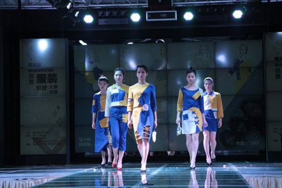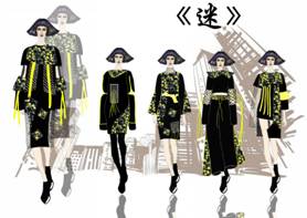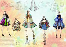 学生作业:在设计过程中,学生形成个人风格,在配色和面料搭配上力争完美,在结合市场流行信息和市场价值基础上尽显创意设计。