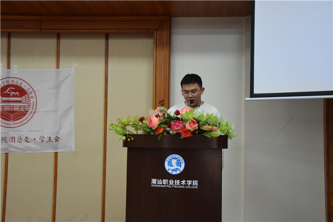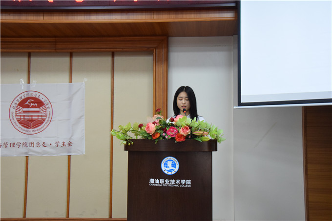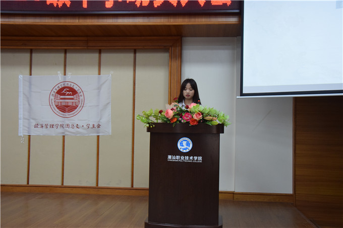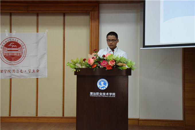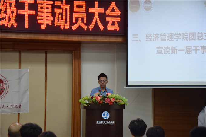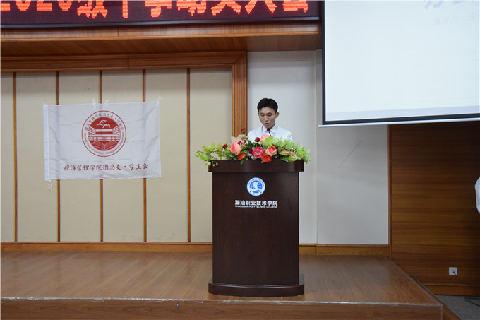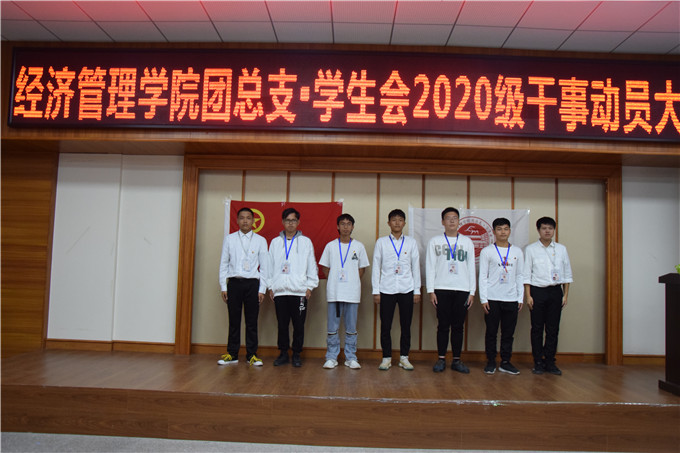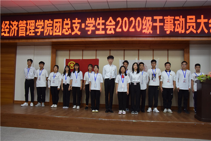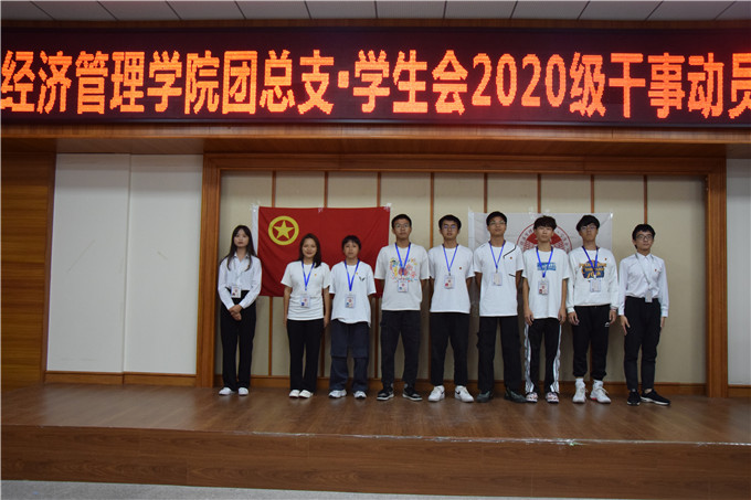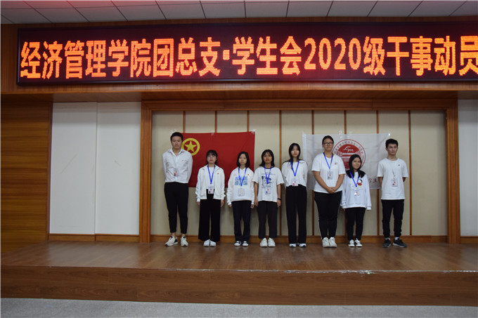 2020年11月4日中午,经济管理学院团总支学生会在第二报告厅召开2020级团学干部动员大会。出席本次会议的领导老师有:经济管理学院党总支书记尹华根、经济管理学院团总支书记陈金辉,本次会议由生活权益部干事谢俊典主持。 大会第一项议程 奏团歌 动员大会在嘹亮的团歌中拉开序幕。 大会第二项议程 党总支书记尹华根致词 尹书记在会议中对团学干部提出希望和要求:他希望团学干部要牢记自身使命,勇于担当责任、要强化服务意识,做好自我管理,要把握宝贵机会,提高综合素质,也要勤奋努力,正确处理学习与工作的关系;希望本届团总支学生会一起努力,不忘初心,继续发扬经管学院优良传统,为学院发展做出新贡献。 大会第三项议程 团总支书记陈金辉宣读新一届干事名单 大会第四项议程 团总支副书记兼学生会执行主席陈小芸发言 她说学生会作为学校的学生组织,是以学生为主体,全心全意为学生、老师服务的组织。希望学生会的每一位成员能够继续发扬“务实创新、甘于奉献、勇于担当”的服务精神。 大会第五项议程 新干事代表杨永堃发言 杨永堃同学表示:作为学生会的新生干事代表,一定会坚定自己的初心,树立脚踏务实的工作态度,努力创新奋斗,为学院的发展贡献自己的一份力量。 大会第六项议程 各部门负责人介绍部门工作内容 大会第七项议程 授牌仪式:为干事佩戴工作牌 大会第八项议程 合影 本次动员大会的顺利举行,让新一届的学生会成员明确了自己身上所肩负的责任,在未来的日子里,学生会将以更加积极和踏实认真的工作态度服务全体师生,为经管学院的发展做出应有的贡献。