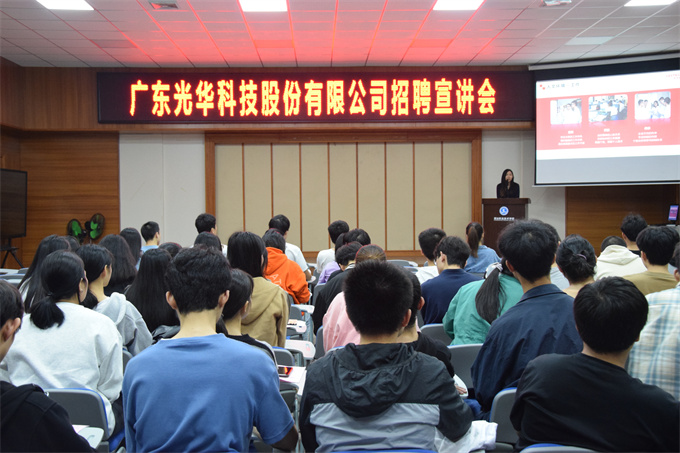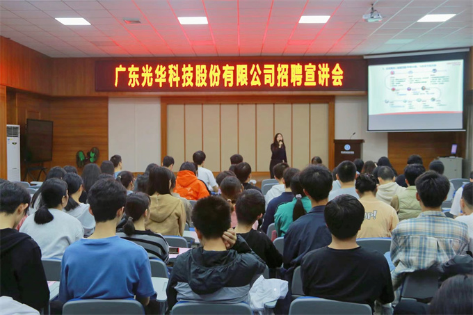 工商学院丨广东光华科技股份有限公司校园招聘宣讲会 2022年11月30日下午三点,广东光华科技股份有限公司招聘宣讲会在第二报告厅举行,参加此次宣讲会的有2020级食品检验检测技术和药品质量与安全两个专业的近200名学生。 广东光华科技股份有限公司人力资源主管蓝婕、招职负责人江英为现场同学作讲解。同学们对他们的到来表示欢迎。 广东光华科技股份有限公司人力资源主管蓝婕、招职负责人江英为现场同学作讲解。同学们对他们的到来表示欢迎。 宣讲会开始,主讲人蓝婕向同学们介绍了广东光华科技股份有限公司的企业概况、发展历程、仪器设备、产品体系、生产制造以及销售供应等,并告诉同学们:公司里的领导们都特别重视人才和关心员工;在新人刚入行的时候,公司会进行内训、外训和分享会等对员工进行培养,确切落实好每个员工的工作能力,培养对公司有用的人才;最后主讲人,对公司内的工作内容,薪资情况,职业发展等进行了详细的说明;会后,部分同学向招职负责人江英递交了个人简历。 本次校园招聘宣讲会为我院2020级的同学们提供了顶岗实习的机会。春来夏往,秋收冬藏,2022年就快过去,小编在这预祝同学们能够找到心仪的工作。