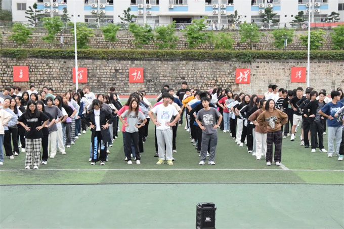 早操前,各班同学快速整队,聚拢到一起,认真聆听学生会工作人员对跑操工作的安排。随后,在学生会工作人员的带领下开始了跑操的热身运动。