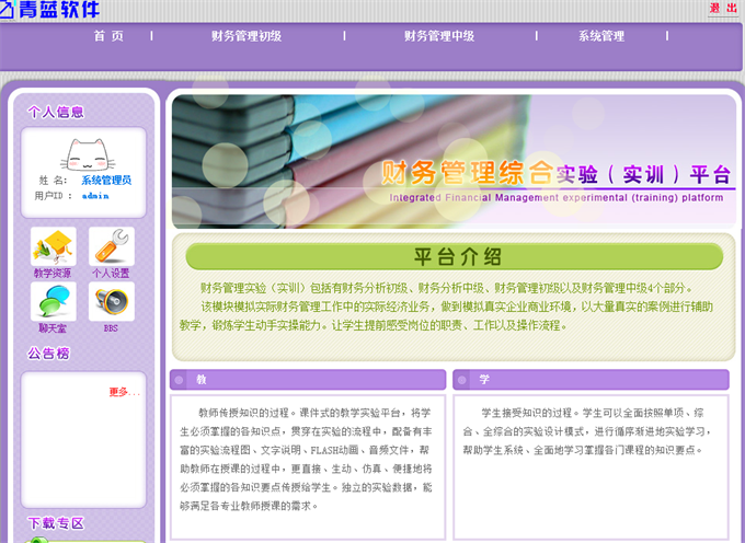 为了提高学生的专业技能能力,培养学生动手操作能力,我系引进由长沙青蓝软件有限责任公司开发的财务管理综合实训(实验)平台,该平台包括有财务分析初级、财务分析中级、财务管理初级以及财务管理中级4个部分, 该实训平台模拟实际财务管理工作中的实际经济业务,做到模拟真实企业商业环境,以大量的案例进行辅助教学,学生接受知识的过程中,可以全面按照单项、综合、全综合的实验设计模式,进行循序渐进地实验学习,从而帮助学生系统、全面地学习掌握各门课程的知识要点。 通过对模拟实训,可以系统地掌握企业财务管理活动的全过程。从而加强我们对理论和知识的理解与认识,完成从理论到实践的认知过程,锻炼了学生的动手实操能力,让学生提前感受岗位的职责、工作以及操作流程。