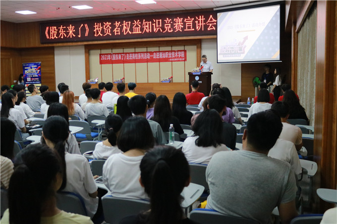 《股东来了》2021投资者权益知识竞赛活动正在全国范围内如火如荼的开展着。东莞证券作为广东片区的承办单位,组织分支机构齐动员、齐部署、齐行动,充分发挥各家自身优势,解放思想,全力推广本次活动。2021年5月17日晚上7点30分,就带着《股东来了》2021主题活动暨投资者权益知识竞赛宣讲会走进了潮汕职业技术学院。 出席嘉宾有张文洲院长、袁洁冰老师、刘嘉星老师以及东莞证券普宁营业部负责人肖创雄、东莞证券普宁营业部投教专员杨永波等等。 活动开始后由校方代表刘嘉星老师主持介绍活动单位及宣讲会目的。随后本活动领导负责人即东莞证券普宁营业部负责人肖创雄上台致辞。 之后由东莞证券普宁营业部投教专员杨永波宣讲本次《股东来了》活动的相关情况,讲解了此次活动的主题、活动目的及活动规则,还说明了本次活动旨在号召学生积极参与答题并通过全国性知识竞赛答题活动,提升学生的学习兴趣,提升对投资知识、权益保护、公司治理、法律法规等相关专业知识的认识和理解。 同时还分享了选股逻辑经验,增加了互动问答环节,赠送礼品。现场的同学也对此次活动表现出了极大的热情,积极参与答题。 第一项议程结束,举行第二项议程第七届“东方财富杯”金融知识讲座专题,由校方代表主持人刘嘉星老师上台对第二个活动第七届“东方财富杯”全国大学生金融精英挑战赛作简单的赛前培训。 活动圆满结束,最后由校方代表主持人刘嘉星老师对于本次活动进行总结。经过此次活动,同学们对《股东来了》投资者权益知识竞赛及“东方财富杯”全国大学生精英挑战赛有了初步的了解,更多的同学对报名参加活动充满积极性,你还在等待什么,赶紧报名参加吧。 第七届"东方财富杯”全国大学生金融精英挑战赛,分为校赛、省赛和国赛三个阶段,参赛学生及团队使用大赛专用平台“东方财富"APP进行模拟交易。 想要报名的同学可通过手机应用商店搜索及下载“东方财富”APP,点击首页“更多”按钮进入新页面,在页面底部选择“金融挑战赛”,或是点击首页左上角-我的头像-金融挑战赛,点击“我要报名”后填写个人信息即可报名或是登录大赛官网:young.eastmoney.com/xyds报名参赛。