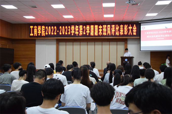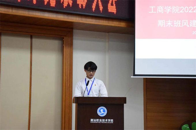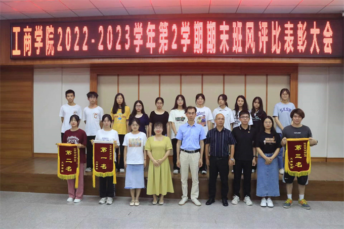 班风评比|树优良班风 展班级风采 2023年6月28日下午三点,工商学院在第二报告厅举办了2022-2023学年第二学期班风评比表彰大会。 出席本次表彰大会的领导老师有: 工商学院院长张文洲 工商学院党总书记尹华根 工商学院院长助理方秀玲 工商学院团委书记陈金辉 22级辅导员陈思思老师 22级辅导员谢佳彤老师 21级和22级各班级班干部代表参加了本次评比表彰大会 会议由学习部干事黄运富主持 班风是一个班级以价值观为核心的、有特色的氛围、行为方式、习惯等等。良好的班风,是衡量一个班级体的重要标准之一,对班级建设具有重要的导向作用;在良好的班风之下,我们前行的脚步会更加坚定,我们发展的方向会更加全面,因此培养一个良好的班风十分重要。 第一项议程:介绍班风评比实施细则和讲解教师反馈表内容 学习部干事吕纯钿同学介绍班风评比方法及具体实施的细则 学习部干事郑炫博同学讲解教师反馈表内容 第二项议程:主持人宣读评比成绩 第一名 22级药质1班成绩89.00分 第二名 22级金融班成绩82.40分 第三名 22级会计3班成绩82.20分 第三项议程:颁奖仪式 院长助理方秀玲为获得第三名的班级颁奖 尹华根书记为获得第二名的班级颁奖 张文洲院长为获得第一名的班级颁奖 第四项议程:获奖班级代表发言 荣获第一名的班级代表孙作朋同学分享他们的班级经验 第五项议程:领导讲话 党总书记尹华根为本次班风评比作总结,首先他对获奖班级表示祝贺以及感谢各班级班委为学院的班风学风的建设起了带头作用。同时尹华根书记也提出一些存在的问题,针对部分班级在学风建设、思想政治教育、考勤问题等方面还有待提高,他希望在场的各班级代表能以获奖班级为榜样,认真总结经验教训,不断完善自身建设。 最后尹书记强调,班级建设是一个长期的过程,需要全体同学共同努力勉励同学们珍惜在校时光,积极参加各种活动,不断提高自己的综合素质。 工商学院党总书记尹华根发言 大合照 小编相信,在同学们的共同努力下,一定能够在学院里形成和谐向上的班风学风,同学们一起为创建良好的班风学风贡献力量。