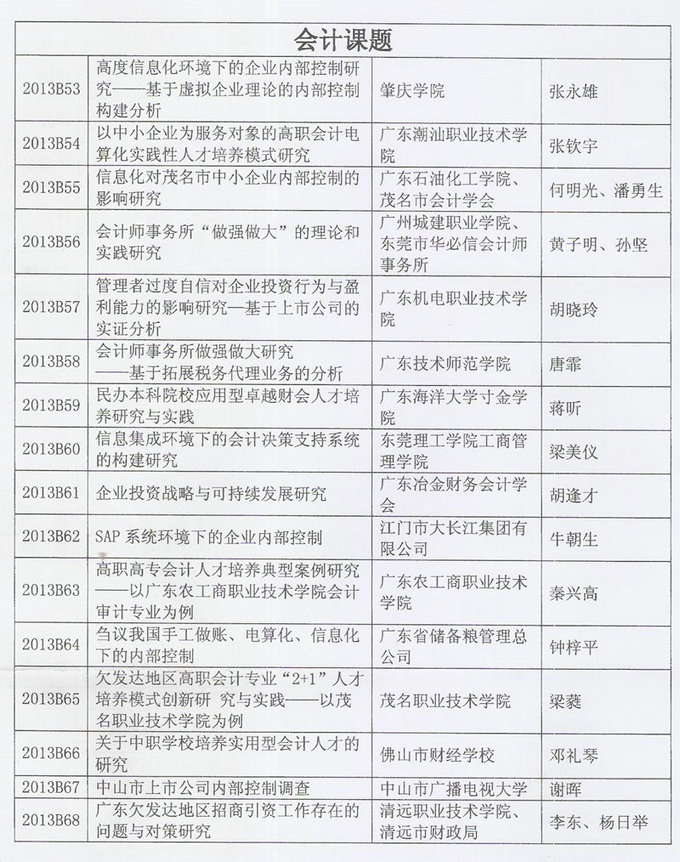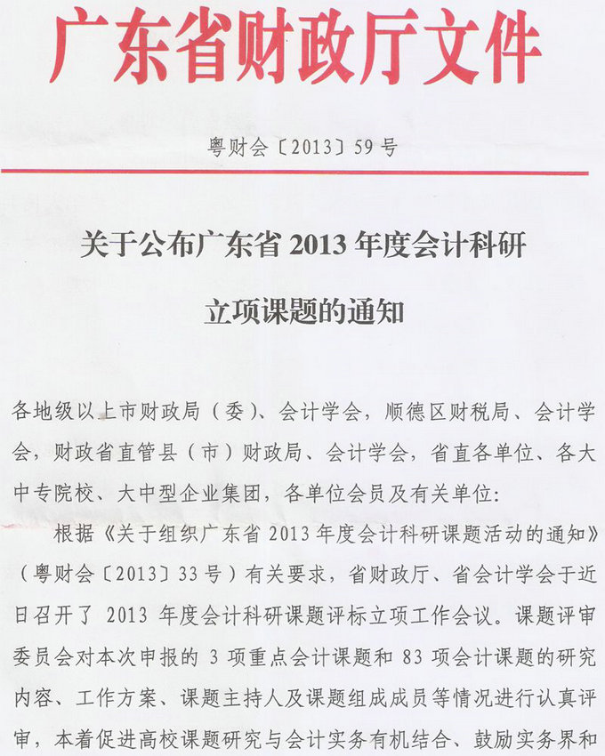 省财政厅捷报,我院财会金融系张钦宇主任主持的《以中小企业为服务对象的高职会计电算化实践性人才培养模式研究》通过评审,中标广东省财政厅2013年度科研立项,此次课题立项,我院首次在行业研究领域获得省级财政部门专项经费。 从广东省财政厅传来捷报,在省财政厅、省会计学会召开的2013年度会计科研课题评标立项工作会议上,我院财会金融系张钦宇主任主持的《以中小企业为服务对象的高职会计电算化实践性人才培养模式研究》项目通过评审,中标广东省财政厅2013年度科研课题立项(粤财会〔2013〕59号),是我院首次在行业研究领域获得由省级财政部门专项经费的科研项目。 今年暑假期间,我院根据粤财会[2013]33号文件精神, 积极组织力量成立了由财会金融系张钦宇主任主持,包括学院魏跃进副院长、学院原财金系主任江峻茂副教授、广东华审会计师事务所刘广强注册会计师、广州钱满溢财税咨询有限公司张波总经理组成的课题组,该课题组充分的体现了理论与实践充分结合结构。课题组成立后结合我院会计电算化专业建设过程中取得成绩,提出了“以中小企业为服务对象的高职会计电算化实践性人才培养模式研究”的课题,经过多方调研,最终形成申报文件。 此次广东省财政厅共计立项一项重点会计课题,68项会计课题。参与课题申报的主要是中山大学、华南师范大学等部属院校、省财政厅科研部门、地市财政部门、省属本专科院校,此次获得立项的科研水平极高,代表着广东省会计研究的先进水平,是同类校中唯一获批的项目。