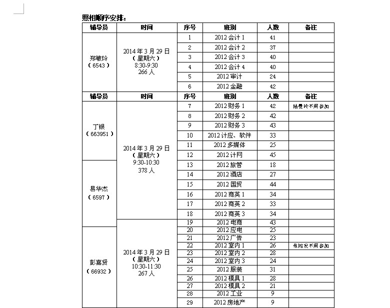 12级各班级: 根据教育部、教育厅要求,毕业生学历证书须进行电子注册(日后可网上查询),并统一由新华社广东分社拍摄组给毕业生进行相片拍摄工作,具体安排如下: 1.时间:2014年3月29日(星期六) 2.地点:综合楼B305 3.年级:2012级学生 4、请各班辅导员、班长组织好此次照相工作,按时间提前十五分钟到场,并按顺序号顺延照相。逾期不候,责任自负。创业班插班和外贸电商学院同学在原班级照。 5、毕业生照相时须携带身份证(没有身份证不能参加拍摄),核对学生个人信息后,按工作人员安排有秩序地进入拍摄房间照相,照相时要露出耳朵和眉毛。 6、照相收费15元/人,请各班长收齐后在3月19日统一交考务科陈老师。 潮汕职业技术学院教务处考务科