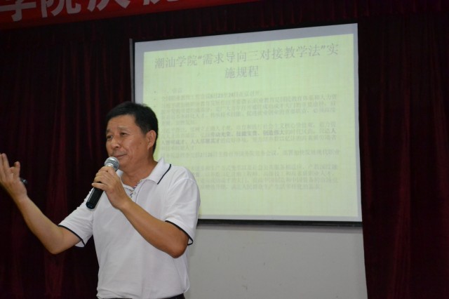 集训会开班由教务处副处长王燕娜主持,院长助理刘教林作了题为《潮汕学院“需求导向‘三对接’教学法”实施规程》的专题讲座,讲座从分析国际国内职业教育教研教改的形式和任务入题,结合潮汕学院教学工作的现状,提出并阐明了实施“需求导向‘三对接’教学法”的现实意义,并对“需求导向‘三对接’教学法”的内涵进行了诠释,对其实施规程的责任主体、基本要求、具体工作和保障措施,进行了详细的论述。往后,潮汕学院的教学工作将紧密围绕“需求导向‘三对接’教学法”展开,并以实施“行为导向‘三基’课堂教学法”为突破口,逐步实施。