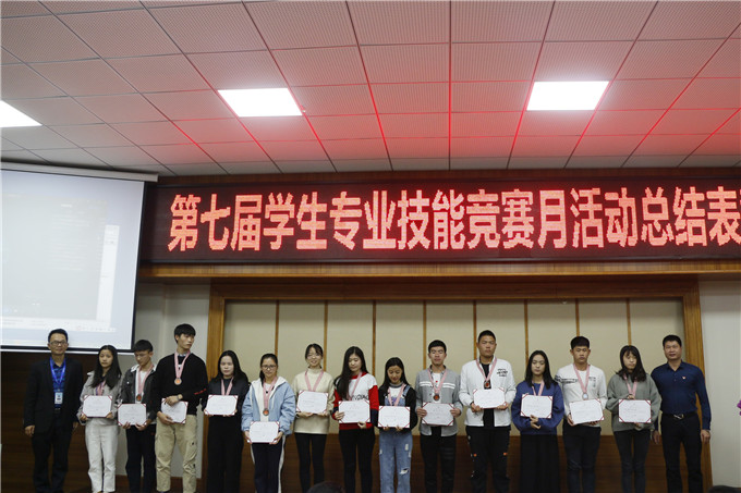 12月19日下午,潮汕职业技术学院第七届学生专业技能竞赛月活动总结表彰大会在学院第一报告厅隆重举行。学院领导、相关部门领导、各竞赛项目负责人与指导老师、全体获奖同学出席了本次表彰大会。会议由教学管理部黄晓枫老师主持。 大会在项目汇报综合视频中拉开了序幕,各二级学院获奖学生代表以视频的方式演示了本届职业技能竞赛月活动成果。接着由获奖学生代表姚子怡同学及指导教师代表巫佛建老师发言,学生代表及指导老师代表都认为学院为全体师生提供的竞赛交流平台很有必要,也很有意义,并表示将最大力度利用平台、利用政策,继续努力,再创佳绩,为学院内涵建设添砖加瓦。 教学管理部部长王燕娜上台宣读表彰决定文件,表彰在技能竞赛月活动中获奖的164名同学,并对获奖的选手表示祝贺。 颁奖环节将现场的气氛推向高潮。分别由党委副书记李育华、学院院长助理颜惠雄、学院副院长魏跃进及党委书记齐广武为获奖学生代表颁发奖项。 最后由齐广武书记作重要讲话,他充分肯定了本次技能竞赛月的效果,并感谢在本次活动中辛勤付出的领导老师们,同时对全体师生提出了三点要求:一是要提高思想认识,树立远大目标;二是要认真总结经验,夯实教学内涵;三是要加大支持力度,提高竞赛成绩。