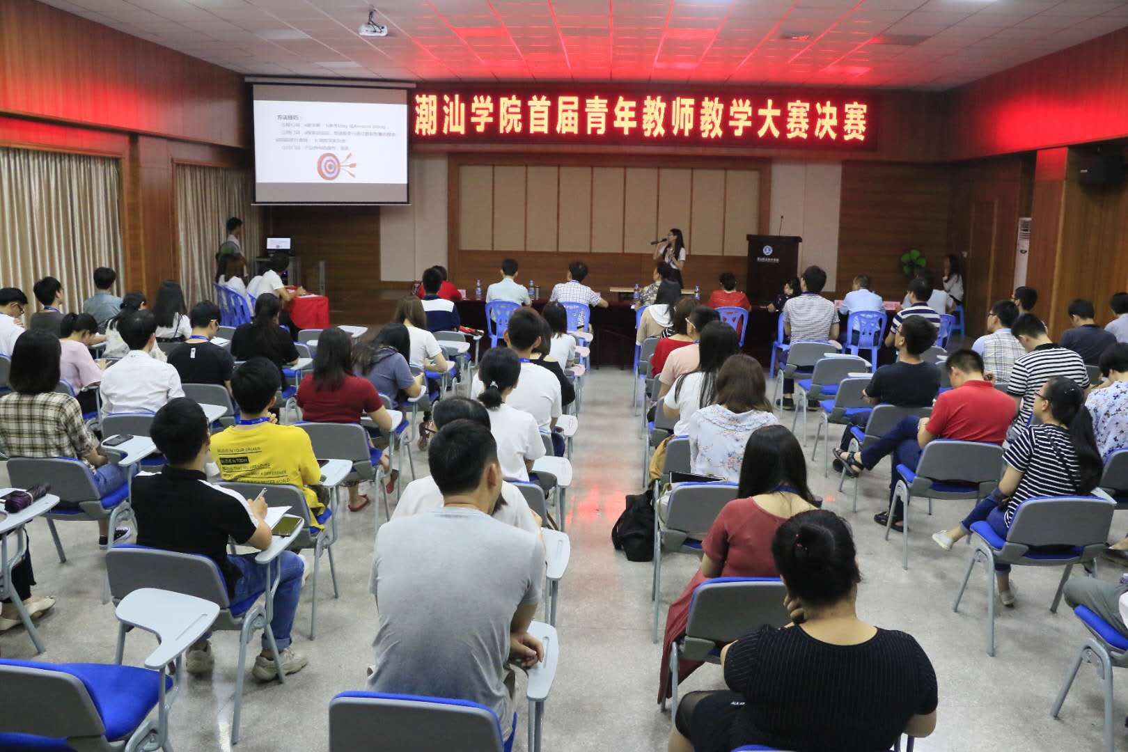 由教学管理部举办的潮汕学院首届青年教师教学大赛决赛,于2019年4月26日下午举行。本次比赛共有来自六个二级学院推荐的14名教师,经过网络评选后,选出6名选手参加决赛。比赛分文科综合组和理科综合组。经过2个半小时紧张的比赛,最终决出文理前三名。其中,文科综合组第一名是来自经济管理学院李冕鸿老师,理科综合组第一名是来自信息工程学院陈树耿老师。 赛后,评委小组组长、督导与师培中心张桂春主任对本次决赛做了点评,张主任从比赛的赛制、意义等对在坐各位老师做了介绍。并且对所有教师就比赛的技巧方法等提出了建议,希望教师能在今后的比赛中取得更好的成绩。 决赛后还有总决赛,希望各位选手再接再厉,也希望本次青年教师比赛取得圆满成功。