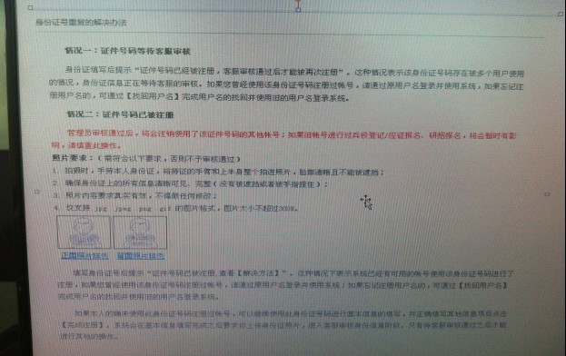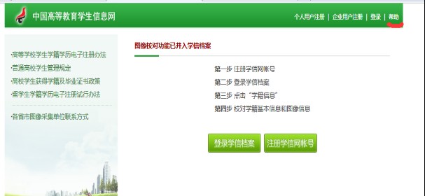 为了确保各位13级同学在学信网(中国高等教育学生信息网http://www.chsi.com.cn/简称“学信网”)图像准确无误,根据教育部相关要求,所有13级学生必须在11月30前登录该网站进行图像校对(毕业照片),不及时进行学信网图像核对的,将不能进行学历证书电子注册。 确认无误之后,务必点击毕业照片核对“正确”按钮选项,否则将不能进行学历电子注册,影响毕业信息的网上查询。关于核对毕业生电子照片的方法,具体操作如下: 登录“中国高等教育学生信息网” http:// www.chsi.com.cn(教育部指定学籍学历查询唯一网站),核对电子照片,具体步骤如下: 1.点击位于网站首页左上方“图像校对”,进入“图像校对系统”; 2. 因图像校对功能并入学信档案,只有先注册学信档案才能查询学历证书电子照片,已注册的可直接用账号密码登录,已注册但又忘记密码的,先按照“帮助”的三个找回密码方法,如图 无法操作时可重新注册,注册时必须用新的手机号码和邮箱,由于之前身份证已被记录,可用“帮助”解决问题,如图(或看后面附件): 如未注册者必须先注册,注册前请认真阅读“学信档案服务条款”。注册账号步骤: (1)按照提示信息注册学信档案,填写有效信箱地址,接收激活邮件,按照网页提示操作; (2)打开注册信箱,如实填写相关信息,因学籍信息的唯一性,身份证号、姓名要和高考录取信息一致方能成功注册,请各位同学使用高考录取身份证号、姓名等信息进行注册,已通过教育厅审核并同意更改身份信息的可按照更改后的信息注册,注册完毕后牢记本人用户名和登录密码,重新登录“中国高等教育学生信息网”。 3.登录“中国高等教育学生信息网”,进入“图像校对系统”,在“个人用户登录”中输入用户名和密码,登录核对学历照片信息; 4.认真核对学历照片和相关个人信息,如相关信息正确无误请点击确认,如有错误请在线提交或请及时联系考务科陈老师,联系电话0663-2290569,短号:68044。 5. 相关信息正确核对无误后请一定提交确认信息,否则学历照片将不能关联至毕业信息,影响毕业证的正常发放。 潮汕职业技术学院教务处 2015年11月12日 附件: 解决身份证重复问题 1、在查询中有学生出现身份证重复问题,原因是之前有登陆过征兵网注册,现查询学籍可以用该账户登陆,如忘记用户名或密码的,解决的方法有以下三种: 方法一是:学生输入所在院校名称、学号、入学年份、层次后,与学籍信息验证通过,即可顺利注册学信档案。无需客服协助,无需同学协助,无需学校烦恼。 学生实名注册时,若系统发现该身份证号已经注册过(不论是被谁注册过),自动跳转到这个页面:学生点【提供学籍或学历信息】成审核。 进入信息填写页面,搞对“学号”很关键。 方法二是:需点击学信网页面右上角的“帮助”,按照提示做相应的操作,在上传照片时必须按照规格上传方有效,如图: 方法三是:如果还不行,请联系网站的客服,记得是发邮件,电话联系不上。