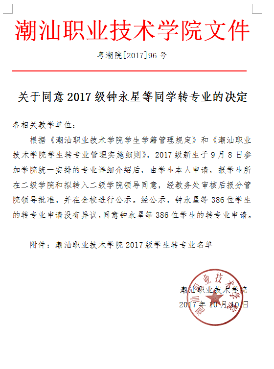 关于同意2017级钟永星等同学转专业的决定