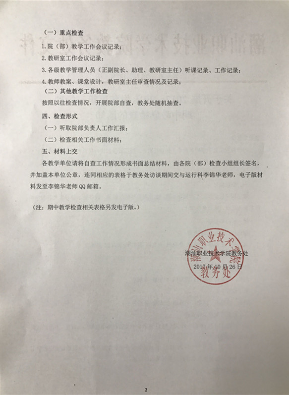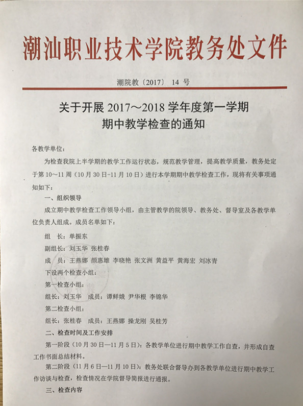 关于开展2017-2018学年度第一学期期中教学检查的通知