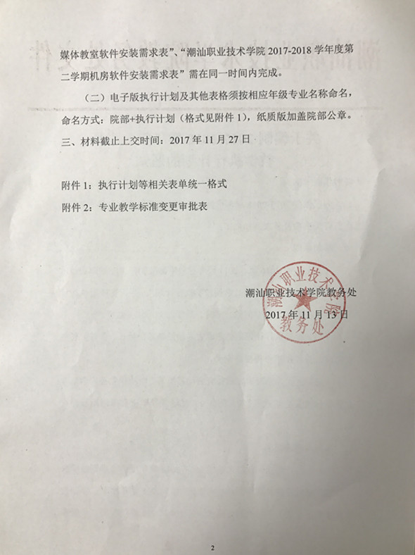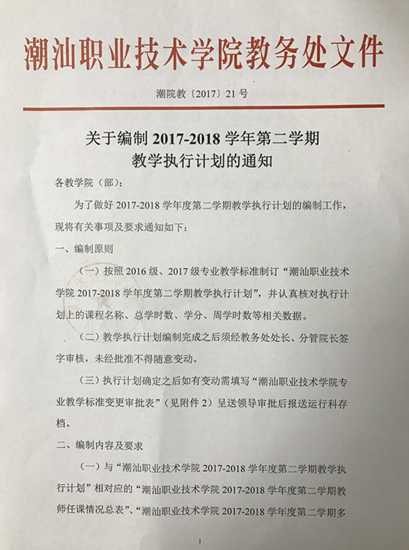 关于编制2017-2018学年第二学期教学执行计划的通知