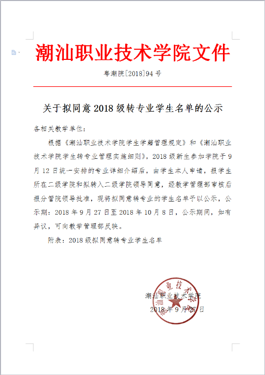 关于拟同意2018级转专业学生名单的公示